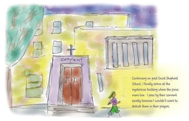 The young child tries to make sense of what the nuns and priests have been teaching her about heaven, hell, and purgatory. Terrified that she’s a sinner who will burn in hell, she strategizes about how to get into heaven.
